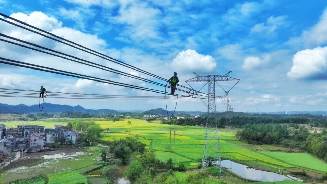 在油菜花田上方的近百米高空,首條過(guò)境江西的±800千伏賓金特高壓輸電線路,在這里進(jìn)行一年一度的計(jì)劃?rùn)z修作業(yè)。