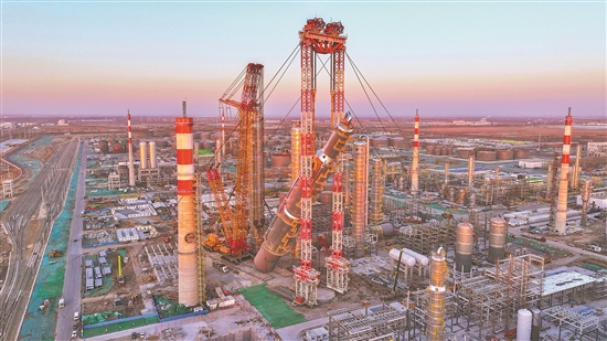2月26日,在華錦阿美精細(xì)化工及原料工程項(xiàng)目施工現(xiàn)場,工程建設(shè)公司一建分公司利用自主研發(fā)的MYQ型5000噸門式起重機(jī)與4000噸履帶式起重機(jī)協(xié)同作業(yè),經(jīng)過1小時36分鐘的精細(xì)操作,成功將總重量達(dá)4366噸的抽余液塔精準(zhǔn)吊裝到位。