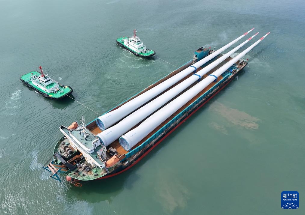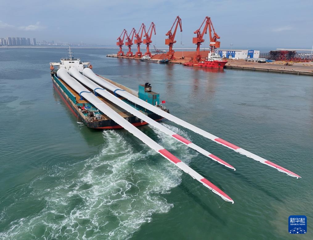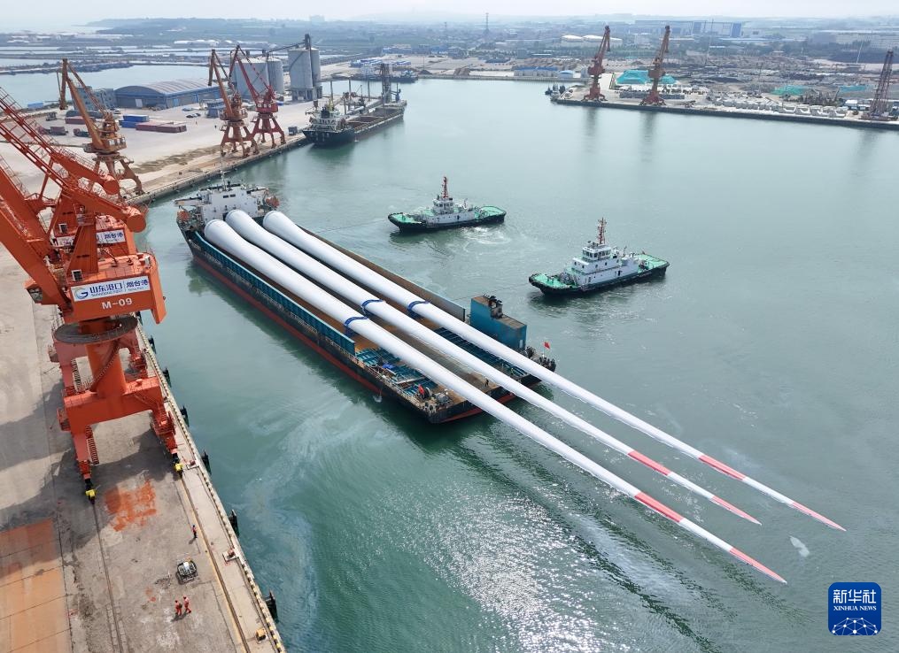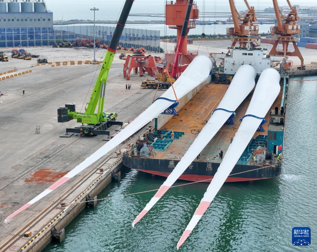 8月1日,超大尺寸海上風電葉片從山東港口煙臺港蓬萊港區(qū)起運(無人機照片)。