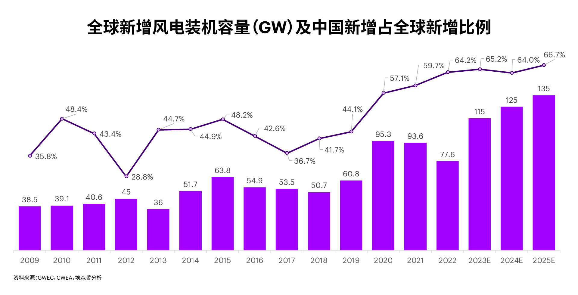 全球新增風(fēng)電裝機(jī)容量及中國(guó)新增占全球新增比例