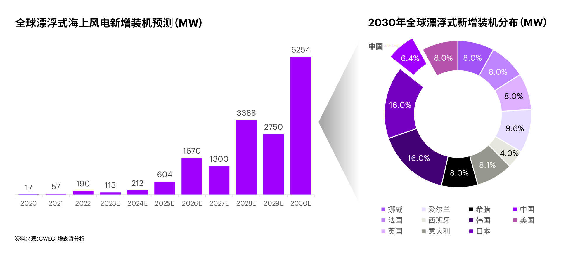 全球漂浮式海上風(fēng)電新增裝機(jī)預(yù)測(cè)及2030年全球分布