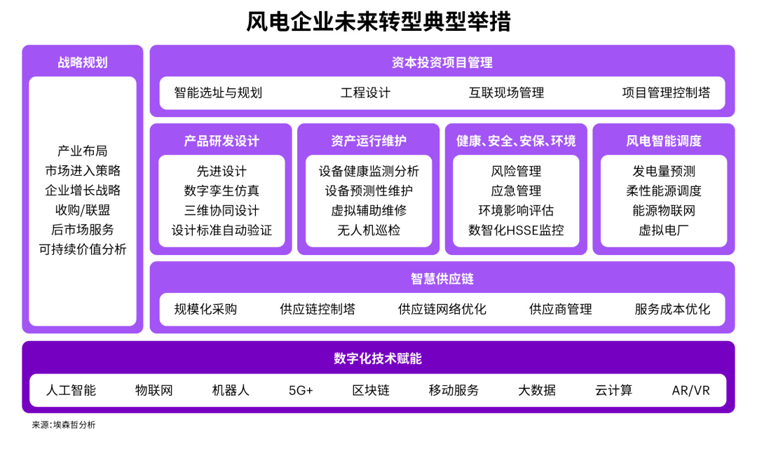 埃森哲認(rèn)為,風(fēng)電企業(yè)可從“戰(zhàn)略規(guī)劃、資本投資項(xiàng)目管理、產(chǎn)品研發(fā)設(shè)計(jì)、資產(chǎn)運(yùn)行維護(hù)、HSSE(健康、安全、安保、環(huán)境)、風(fēng)電智能調(diào)度、智慧供應(yīng)鏈、數(shù)字化技術(shù)賦能”八個(gè)方面布局進(jìn)階之路,行穩(wěn)致遠(yuǎn)。