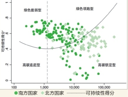 研究發(fā)現(xiàn),可持續(xù)性與經(jīng)濟(jì)發(fā)展呈現(xiàn)“U型”關(guān)系。當(dāng)經(jīng)濟(jì)發(fā)展跨越人均GDP約為1254美元水平的關(guān)鍵拐點(diǎn)后,一國(guó)可持續(xù)性維度在經(jīng)歷谷底后開(kāi)始穩(wěn)步回升,經(jīng)濟(jì)增長(zhǎng)逐漸與碳排放“脫鉤”。基于這條U型曲線及各國(guó)當(dāng)前可持續(xù)性的實(shí)際表現(xiàn),可以將全球國(guó)家劃分為四種不同的發(fā)展路徑類型,即綠色脆弱型經(jīng)濟(jì)體、高碳鎖定型經(jīng)濟(jì)體、綠色領(lǐng)跑型經(jīng)濟(jì)體、高碳追趕型經(jīng)濟(jì)體。