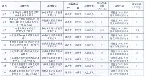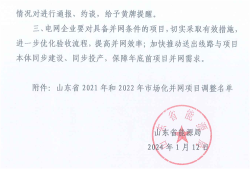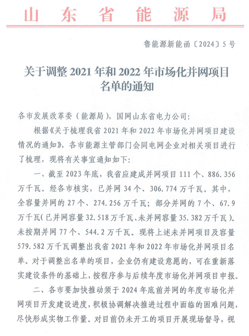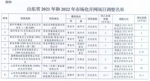 1月12日,山東能源局發(fā)布文件《關(guān)于調(diào)整2021年和2022年市場化并網(wǎng)項目名單的通知》,將未按時并網(wǎng)項目及容量579.582萬千瓦調(diào)整出2021年和2022年市場化并網(wǎng)項目名單。