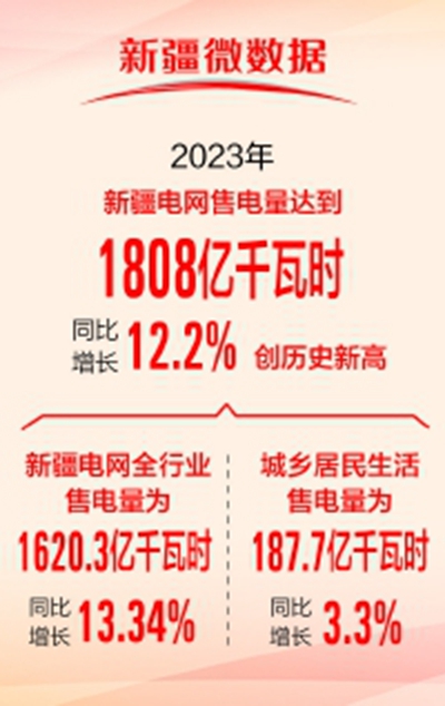 記者從國(guó)網(wǎng)新疆電力有限公司獲悉:2023年,新疆電網(wǎng)售電量達(dá)到1808億千瓦時(shí),同比增長(zhǎng)12.2%,創(chuàng)歷史新高。