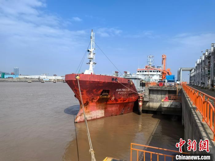24日,裝載著500噸綠色甲醇的“太陽小蒼蘭”輪靠泊洋山港申港石油碼頭開始卸貨作業(yè)。洋山港海事局供圖