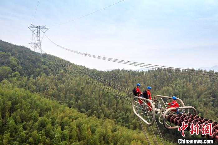 國網(wǎng)衢州供電公司員工對(duì)±800千伏線路開展上揚(yáng)壓接管檢查。吳佳宜攝