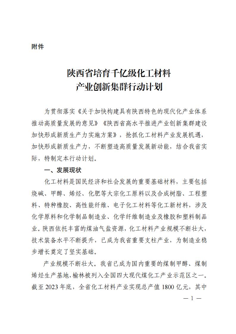 為貫徹落實(shí)《關(guān)于加快構(gòu)建具有陜西特色的現(xiàn)代化產(chǎn)業(yè)體系推動高質(zhì)量發(fā)展的意見》《陜西省高水平推進(jìn)產(chǎn)業(yè)創(chuàng)新集群建設(shè)加快形成新質(zhì)生產(chǎn)力實(shí)施方案》,搶抓化工材料產(chǎn)業(yè)發(fā)展機(jī)遇,加快形成新質(zhì)生產(chǎn)力,不斷塑造高質(zhì)量發(fā)展新動能,結(jié)合我省實(shí)際,特制定《陜西省培育千億級化工材料產(chǎn)業(yè)創(chuàng)新集群行動計劃》。