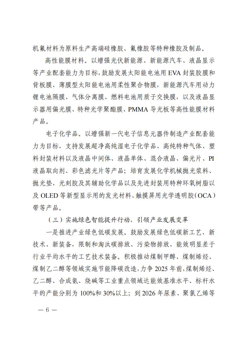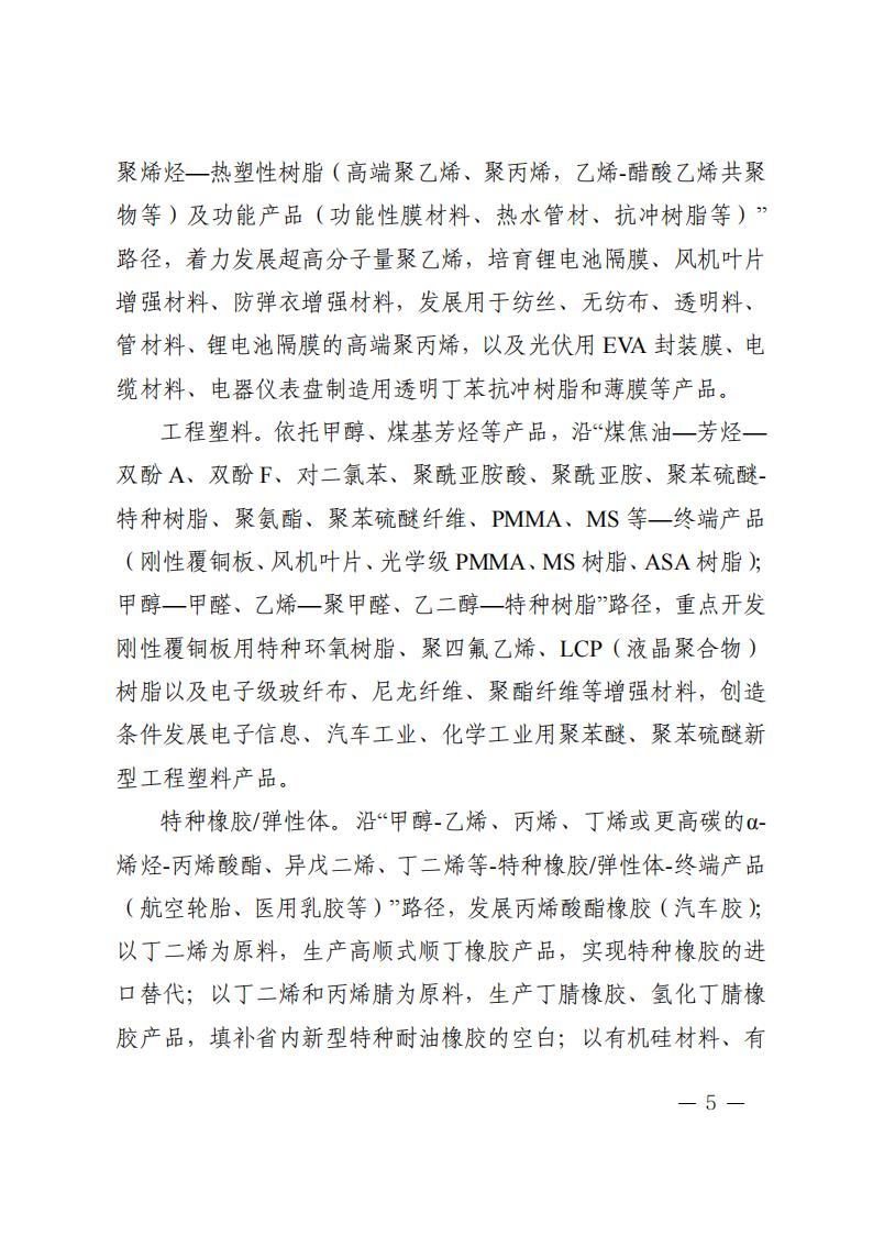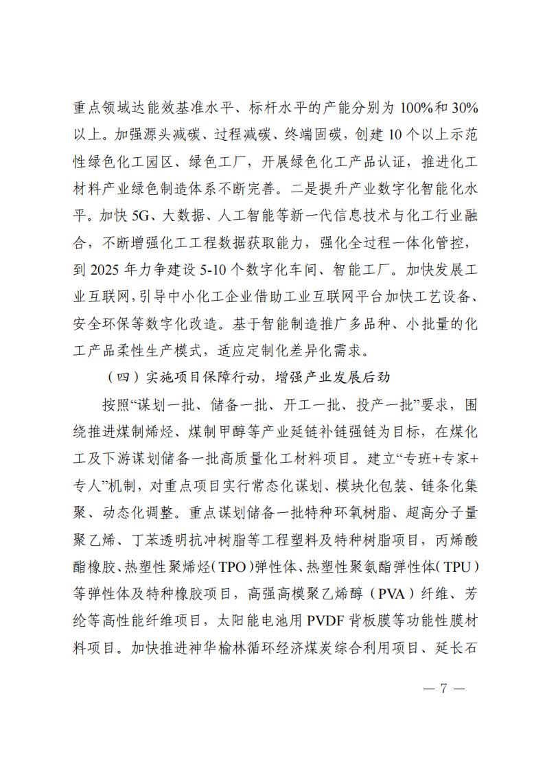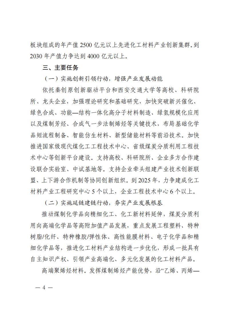 《計劃》指出,實(shí)施創(chuàng)新引領(lǐng)行動,增強(qiáng)產(chǎn)業(yè)發(fā)展動能 依托秦創(chuàng)原創(chuàng)新驅(qū)動平臺和西安交通大學(xué)等高校、科研院 所、龍頭企業(yè),加強(qiáng)理論研究和基礎(chǔ)研究,加快突破新興催化、 綠色合成、功能—結(jié)構(gòu)一體化高分子材料制造、綠氫規(guī)模化應(yīng)用 以及煤制芳烴、合成氣一步法制烯烴等關(guān)鍵技術(shù),布局基礎(chǔ)化學(xué) 品短流程制備、智能仿生材料、新型儲能材料等前沿技術(shù)。加快 推進(jìn)國家級現(xiàn)代煤化工工程技術(shù)中心、省級煤炭分質(zhì)利用工程技 術(shù)中心等創(chuàng)新平臺建設(shè)。支持高校、科研院所、企業(yè)多方合作建 設(shè)聯(lián)合實(shí)驗(yàn)室、中試基地等。支持企業(yè)牽頭組建產(chǎn)業(yè)技術(shù)創(chuàng)新聯(lián) 盟、上下游合作機(jī)制等協(xié)同創(chuàng)新組織。到 2025 年,力爭建成化工 材料產(chǎn)業(yè)工程研究中心 5 個以上,企業(yè)工程技術(shù)中心 6 個以上。
