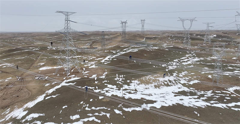 國(guó)網(wǎng)青海省電力公司輸電專業(yè)人員走線驗(yàn)收新建750千伏紅旗輸變電工程線路。國(guó)網(wǎng)青海超高壓公司供圖
