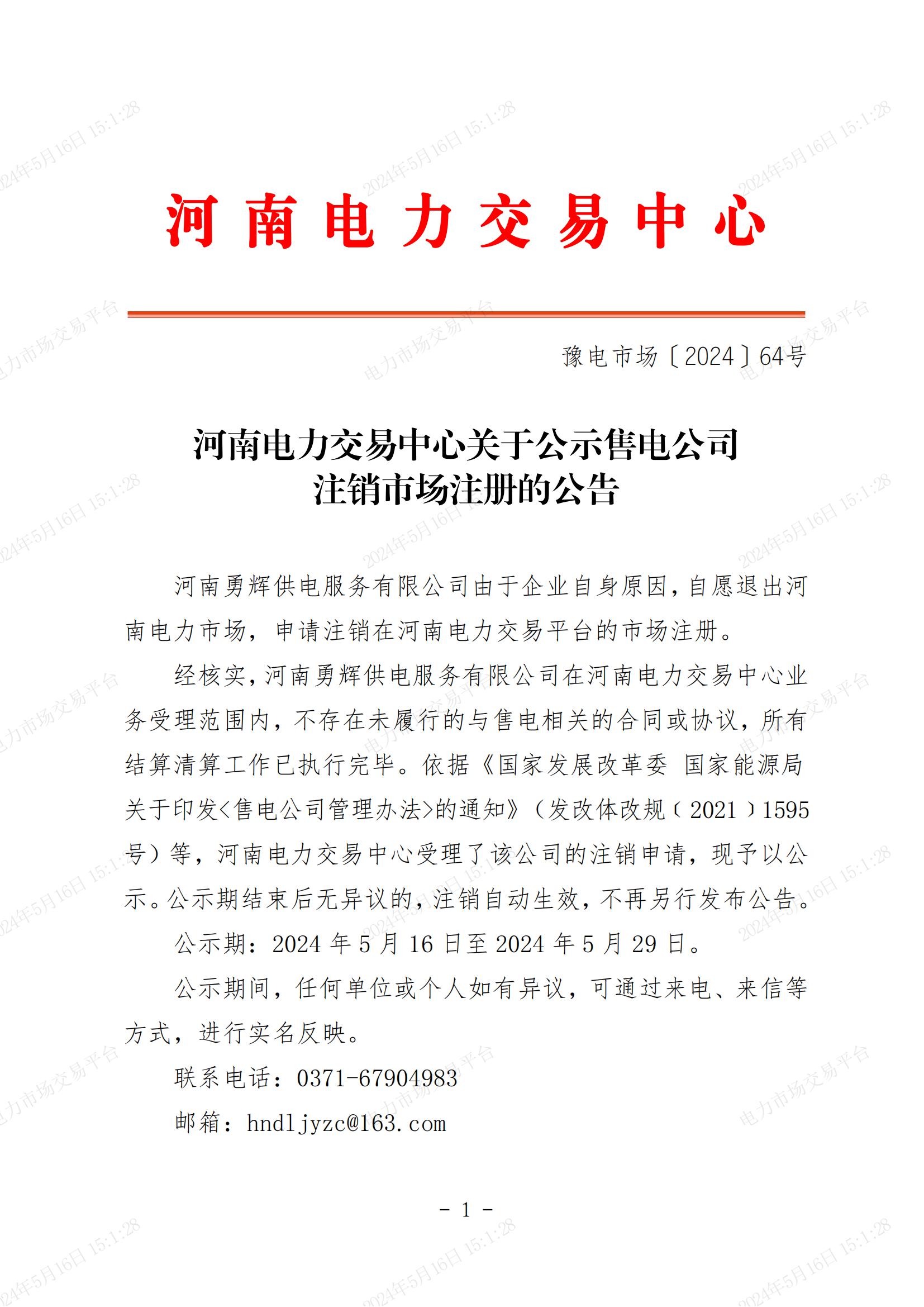 近日,河南電力交易中心關于公示售電公司注銷市場注冊的公告,詳情如下:
