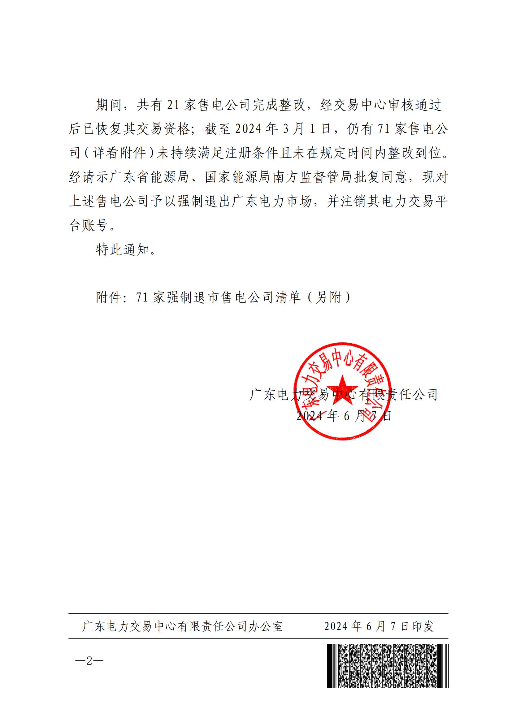 通知指出,2023年,廣東電力交易中心對(duì)廣東電力市場(chǎng)目錄內(nèi)所有售電公司開(kāi)展了持續(xù)滿足注冊(cè)條件的核查工作,對(duì)92家售電公司限期整改,截至2024年3月1日,仍有71家售電公司未持續(xù)滿足注冊(cè)條件且未在規(guī)定時(shí)間內(nèi)整改到位。經(jīng)請(qǐng)示廣東省能源局、國(guó)家能源局南方監(jiān)督管局批復(fù)同意,現(xiàn)對(duì)上述售電公司予以強(qiáng)制退出廣東電力市場(chǎng),并注銷其電力交易平臺(tái)賬號(hào)。