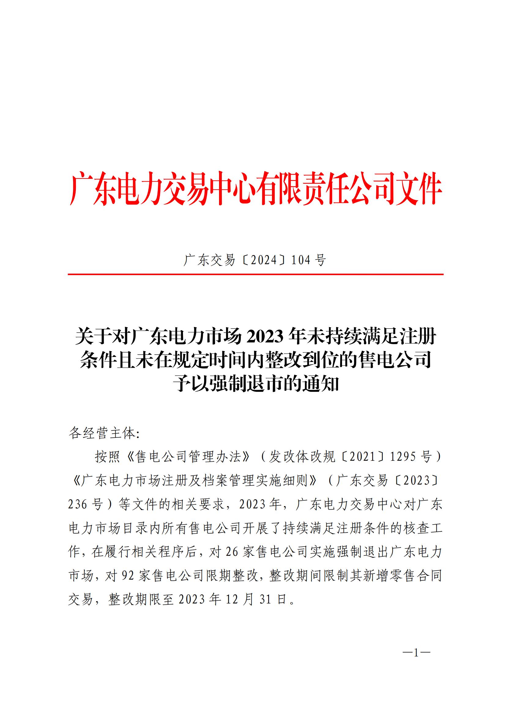 6月7日,廣東電力交易中心發(fā)布關(guān)于對(duì)廣東電力市場(chǎng)2023年未持續(xù)滿足注冊(cè)條件且未在規(guī)定時(shí)間內(nèi)整改到位的售電公司予以強(qiáng)制退市的通知。