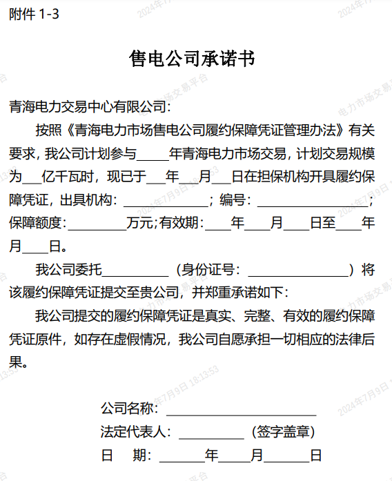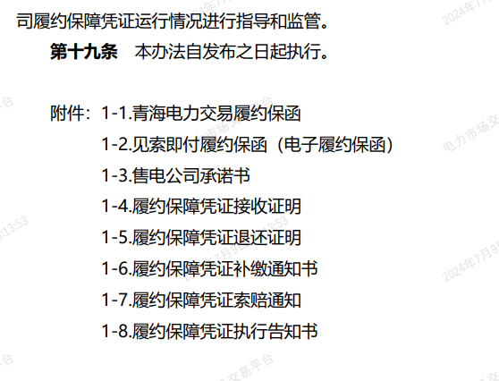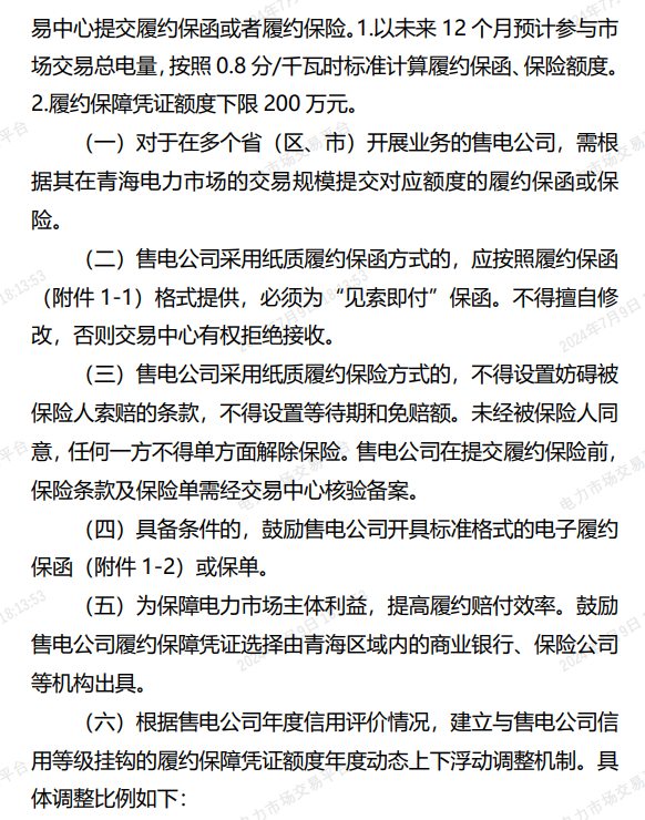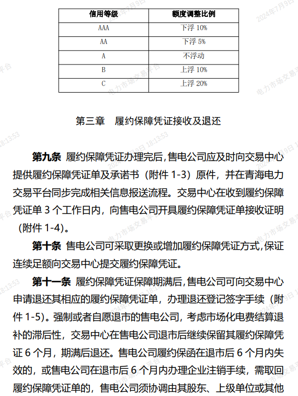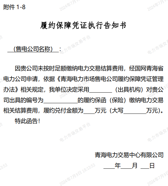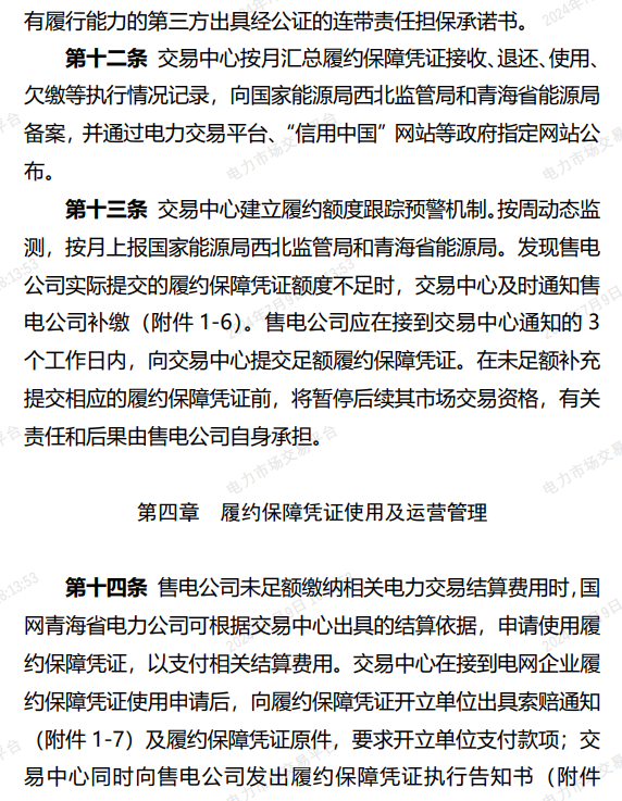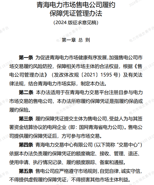 近日,青海電力市場管理委員會秘書處發(fā)布了關(guān)于征求青海電力市場售電公司履約保障憑證管理辦法意見建議的通知,文件提到,參與次年青海電力市場交易的售電公司應(yīng)于每年11月20日前向交易中心提供足額的履約保障憑證;年內(nèi)新增參與青海電力市場交易的售電公司,應(yīng)當(dāng)于參與交易10個工作日前,提供足額的履約保障憑證。履約保障憑證終止日期應(yīng)不早于其所參與交易的電費清算終止日期(一般為交易當(dāng)年1月1日起至次年3月31日止)。