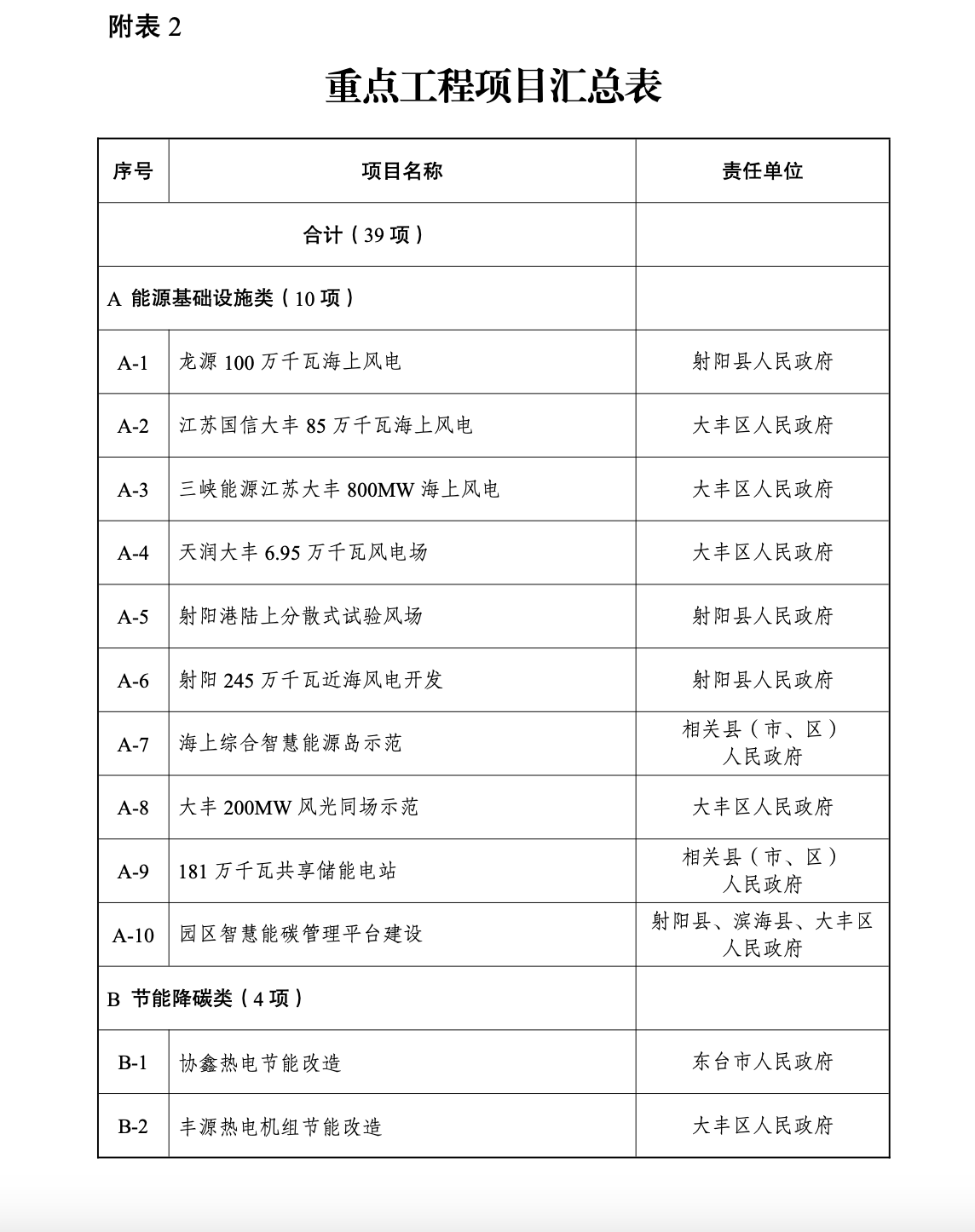 據(jù)《方案》,其中重點(diǎn)工程項(xiàng)目匯總表內(nèi)共含約7個(gè)風(fēng)電相關(guān)項(xiàng)目,包括龍?jiān)?00萬千瓦海上風(fēng)電、江蘇國信大豐85萬千瓦海上風(fēng)電、三峽能源江蘇大豐800MW海上風(fēng)電、天潤大豐6.95萬千瓦風(fēng)電場、射陽港陸上分散式試驗(yàn)風(fēng)場、射陽245萬千瓦近海風(fēng)電開發(fā)、大豐200MW風(fēng)光同場示范等項(xiàng)目。