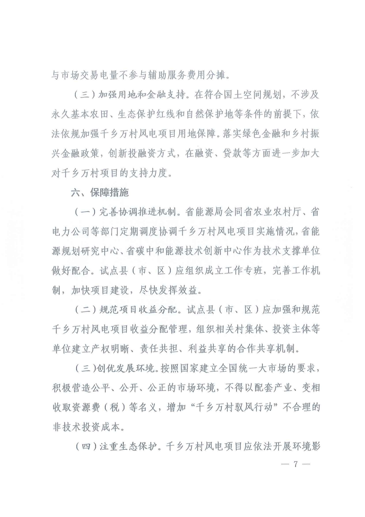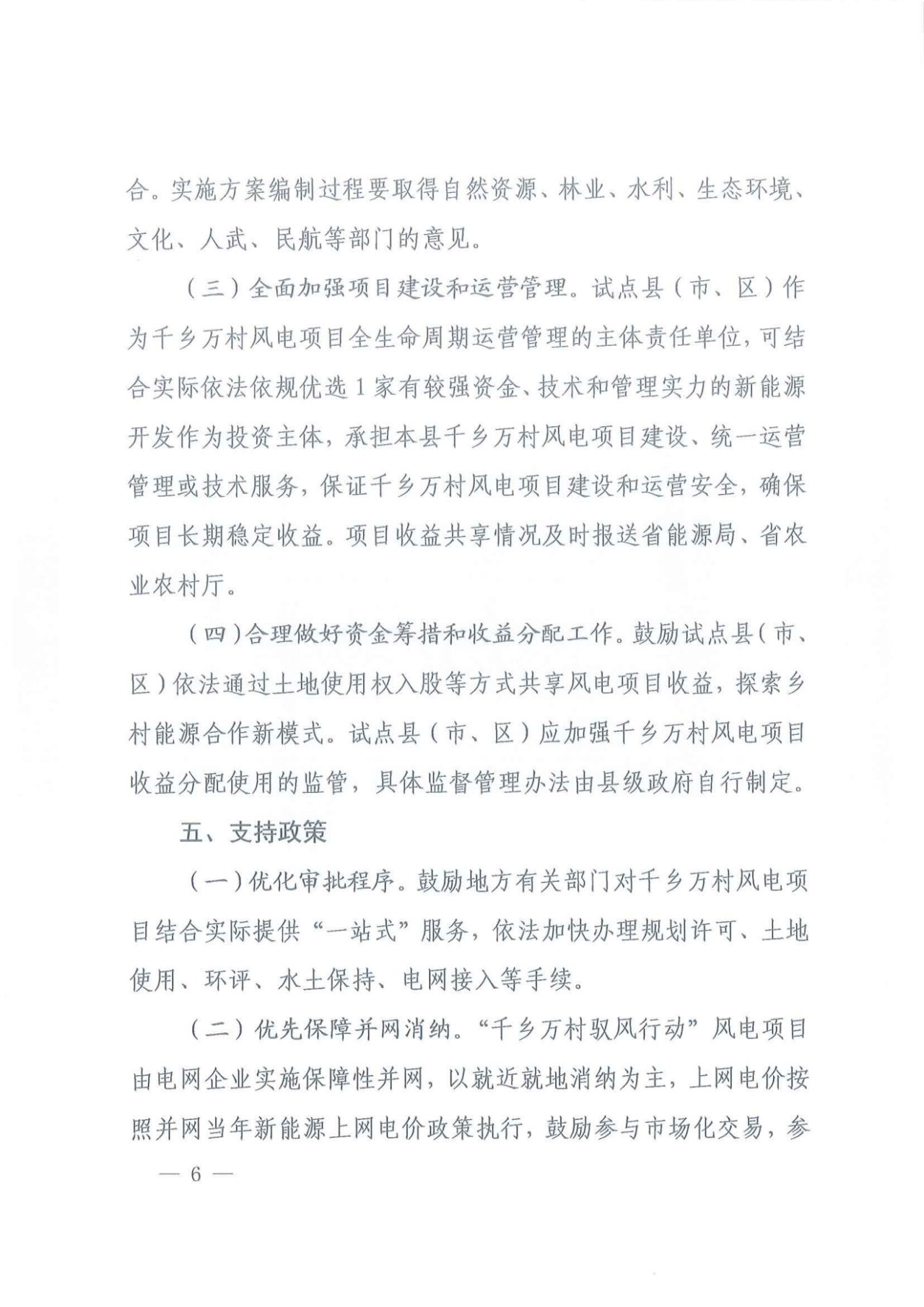 根據(jù)《方案》,以縣為單位實施,選擇有條件、有意愿的村集體參與,依托有實力的新能源開發(fā)企業(yè)開展縣企合作,以收益共享為目的,充分調(diào)動村集體和投資企業(yè)雙方積極性,充分尊重農(nóng)民意愿和村集體決策,切實保障農(nóng)民利益,使風電發(fā)展更多惠及農(nóng)村農(nóng)民,賦能鄉(xiāng)村振興。