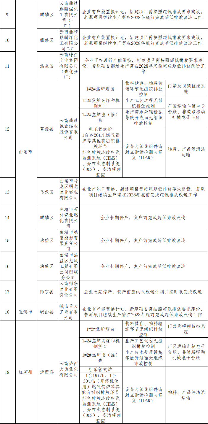 云南省焦化企業(yè)超低排放改造任務(wù)清單