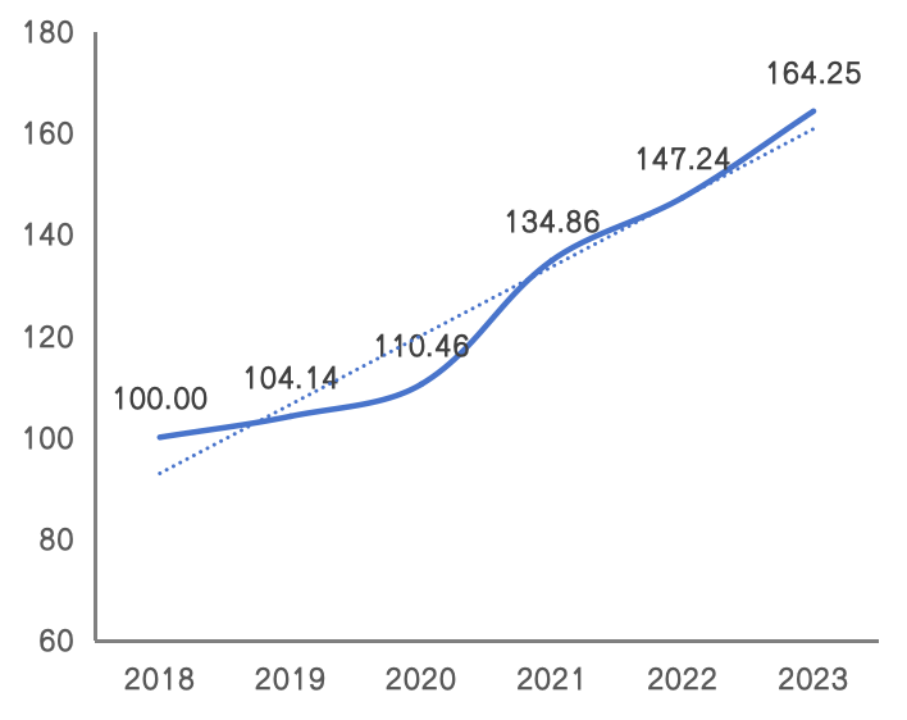 指數(shù)結果顯示,2023年,內蒙古現(xiàn)代能源經(jīng)濟發(fā)展指數(shù)高速增長,達164.25點,同比增長11.55%,基期以來年均復合增長10.43%,發(fā)展質速較前期進一步提升。從分項指數(shù)看,低碳轉型、創(chuàng)新驅動、經(jīng)濟高效和社會貢獻四大維度發(fā)展均穩(wěn)中向好、好中有進、進中蓄勢,在錯綜復雜的國內外形勢挑戰(zhàn)下彰顯了內蒙古現(xiàn)代能源經(jīng)濟的活力與潛力。