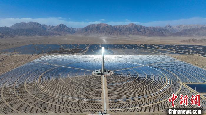 圖為4月15日,在青海省德令哈市,青海中控50MW光熱電站如戈壁灘上的“藍(lán)色海洋”。該光熱電站是中國首批光熱發(fā)電示范項目之一,也是全球首個年發(fā)電量超過年設(shè)計發(fā)電量的塔式熔鹽儲能光熱電站。(無人機照片)馬銘言 攝