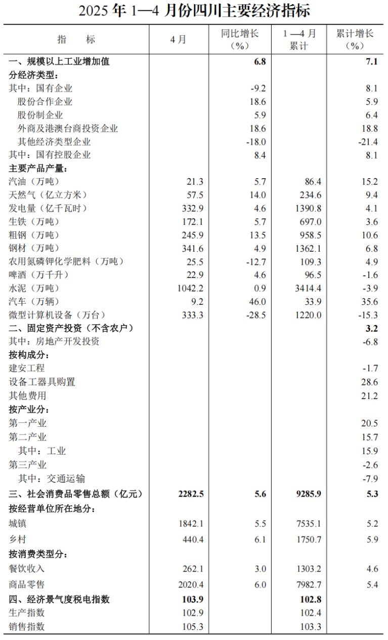 5月20日,四川統(tǒng)計局發(fā)布數(shù)據(jù)顯示,2025年1-4月全省國民經(jīng)濟(jì)主要指標(biāo)數(shù)據(jù)。