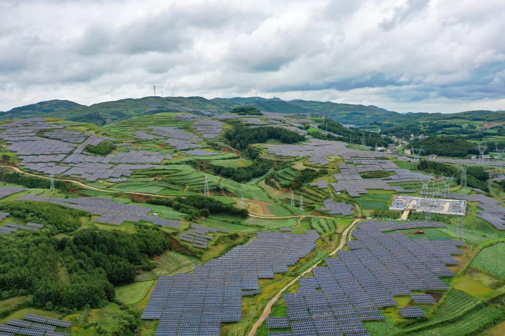 6月24日,貴州省威寧縣雙龍鎮(zhèn)高山村的仙水窩農(nóng)業(yè)光伏電站,滿山蔚藍(lán)的光伏板錯(cuò)落有致。