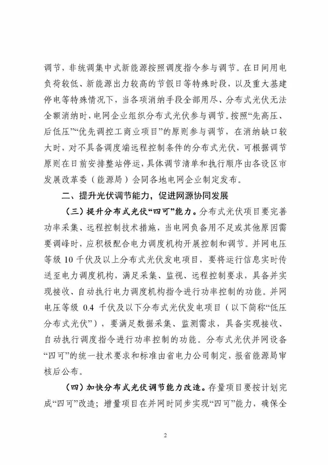 在日間用電負(fù)荷較低、新能源出力較高的節(jié)假日等特殊時(shí)段,以及重大基建停電等特殊情況下,當(dāng)各項(xiàng)消納手段全部用盡、分布式光伏無(wú)法全額消納時(shí),電網(wǎng)企業(yè)組織分布式光伏參與調(diào)節(jié)。按照“先高壓、后低壓”“優(yōu)先調(diào)控工商業(yè)項(xiàng)目”的原則參與調(diào)節(jié),在消納缺口較大時(shí),對(duì)不具備調(diào)度端遠(yuǎn)程控制條件的分布式光伏,可根據(jù)調(diào)節(jié)原則在日前安排整站停運(yùn),具體調(diào)節(jié)清單和執(zhí)行順序由各設(shè)區(qū)市發(fā)展改革委(能源局)會(huì)同各地電網(wǎng)企業(yè)制定發(fā)布。