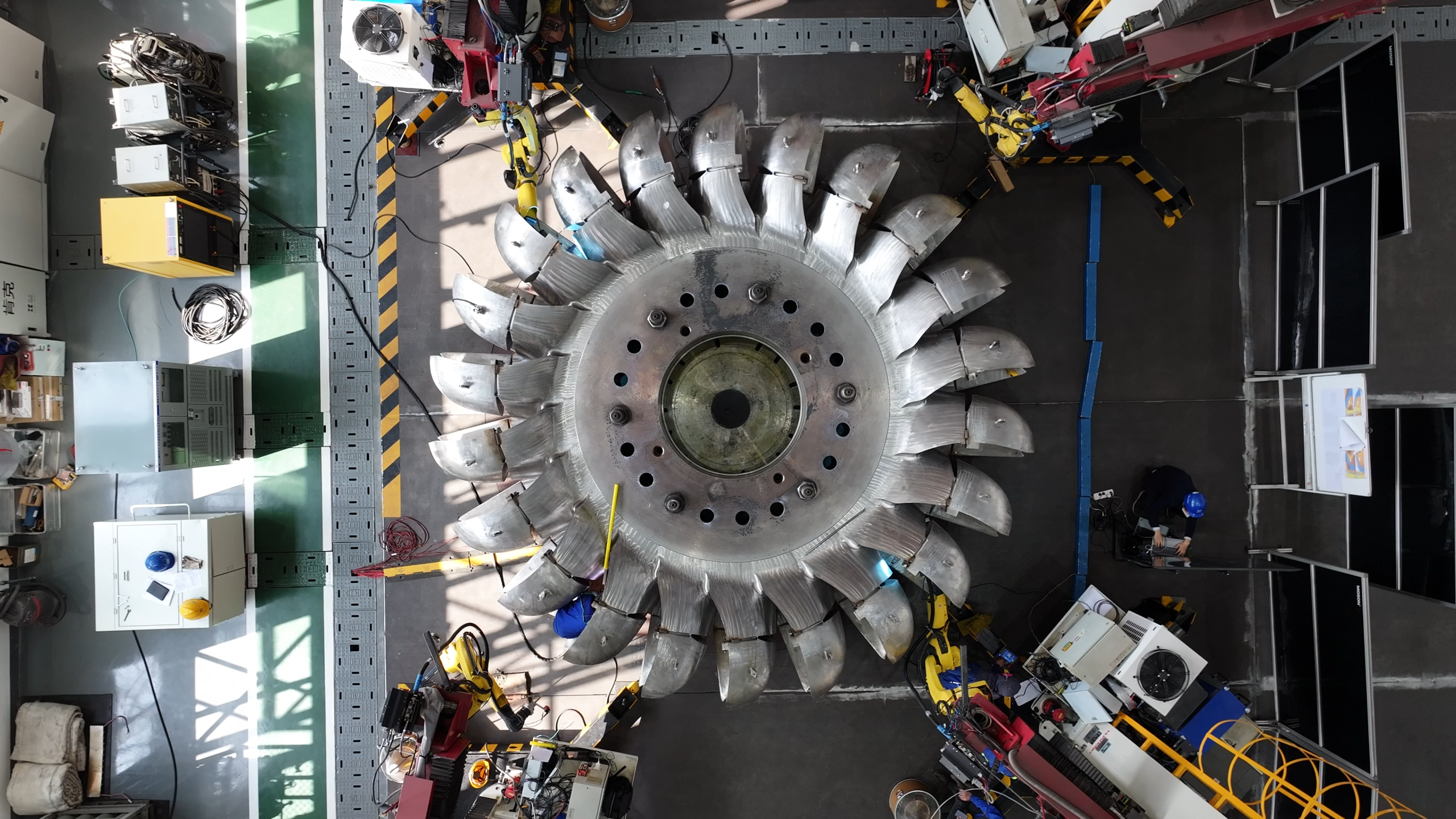 在整個轉(zhuǎn)輪制造完成之后,轉(zhuǎn)輪直徑達(dá)到6.2米,整個重量達(dá)到90噸,其中通過機(jī)器人增材技術(shù)的增材制造量超過6噸。增材制造完成后,轉(zhuǎn)輪將“長”出一片片花瓣形的水斗,這項(xiàng)工藝也被稱為“鐵臂繡花”。這項(xiàng)技術(shù)非常適合于復(fù)雜型面結(jié)構(gòu)部件的定制化制造,而東方電氣也是國內(nèi)唯一一家將機(jī)器人增材制造技術(shù)應(yīng)用于大型沖擊式轉(zhuǎn)輪制造的企業(yè)。