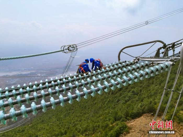 檢修人員為特高壓工程輸電線路更換自爆絕緣子。羅伍達(dá)攝