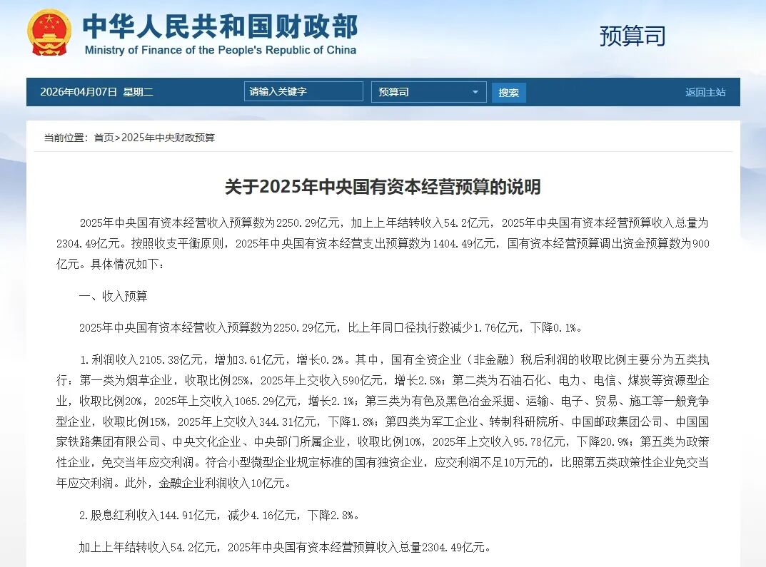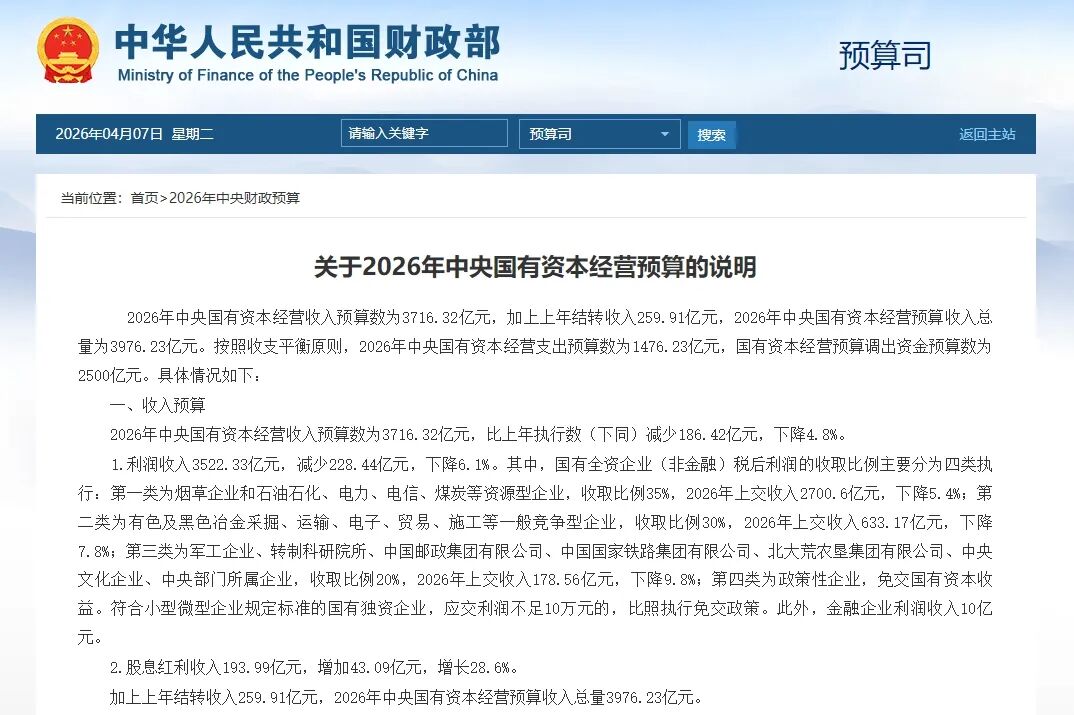 日前,財政部披露了2026年中央財政預(yù)算。其中,關(guān)于2026年中央國有資本經(jīng)營預(yù)算的說明中顯示,2026年國有全資企業(yè)(非金融)稅后利潤的收取比例主要分為四類執(zhí)行,第一類為煙草企業(yè)和石油石化、電力、電信、煤炭等資源型企業(yè),收取比例35%。