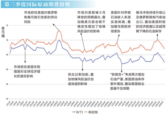 10月10日,受到美國威脅大幅提高關稅、“歐佩克+”持續(xù)增產(chǎn)以及中東地區(qū)地緣政治風險溢價消退等因素的影響,WTI原油期貨價格較前一個交易日下跌4.2%,達58.9美元/桶,布倫特原油期貨價格較前一個交易日下跌3.8%,達62.73美元/桶。進入10月以來,國際油價接連下挫。而剛剛過去的第三季度,國際油價運行中樞上移。布倫特原油期貨價格均價為68.17美元/桶,比第二季度均價上漲1.46美元/桶。