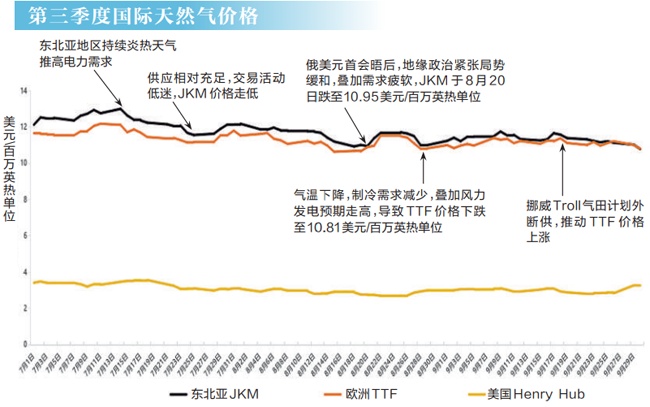氣價方面,7月上旬貿(mào)易商及終端用戶加大采購力度,氣價波動走高,7月14日JKM價格由月初的12.13美元/百萬英熱單位上漲至13美元/百萬英熱單位。此后需求放緩,氣價回落。臨近月末,中美和中歐貿(mào)易緊張局勢緩和,疊加美國或制裁俄羅斯貿(mào)易伙伴推動氣價連續(xù)上漲。8月,受需求放緩以及俄美緊張局勢緩解的影響,氣價回落。9月淡季到來,氣價小幅波動,整體持穩(wěn)。第三季度,JKM均價為11.73美元/百萬英熱單位,環(huán)比降幅達4%,同比降幅達10%。