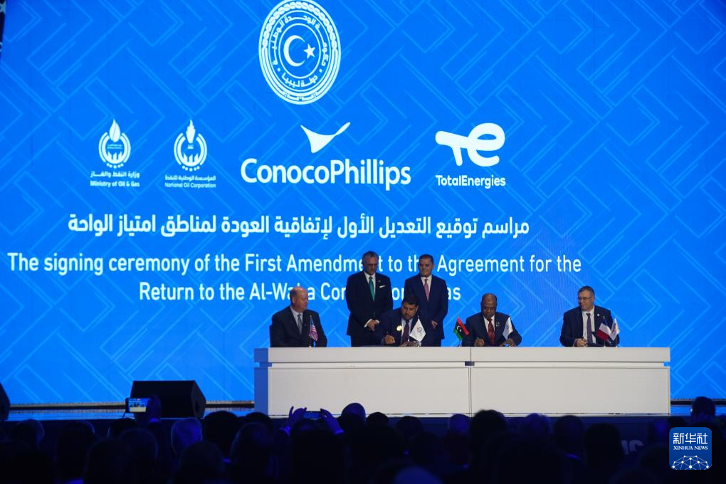 1月24日,在利比亞首都的黎波里,利比亞與法國道達(dá)爾能源公司和美國康菲石油公司舉行協(xié)議簽字儀式。新華社發(fā)(哈澤姆·圖爾基亞攝)