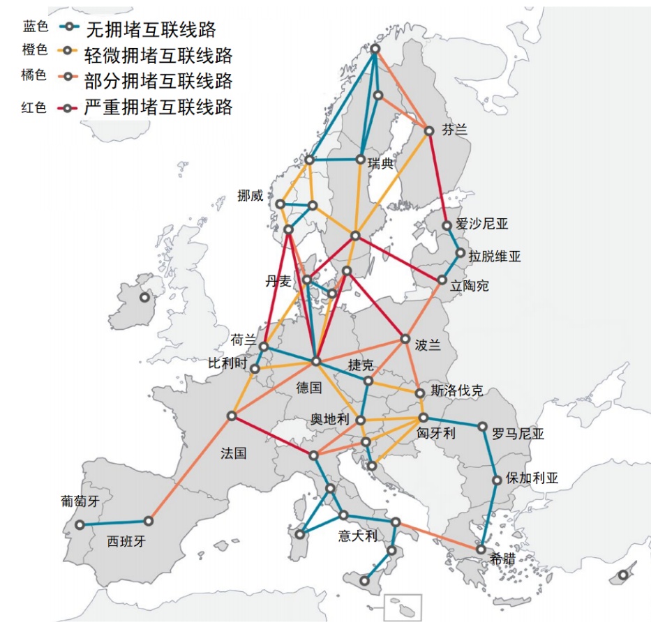 圖1歐盟各競(jìng)價(jià)區(qū)電網(wǎng)擁堵情況示意圖(來(lái)源:歐盟能源監(jiān)管合作署ACER)