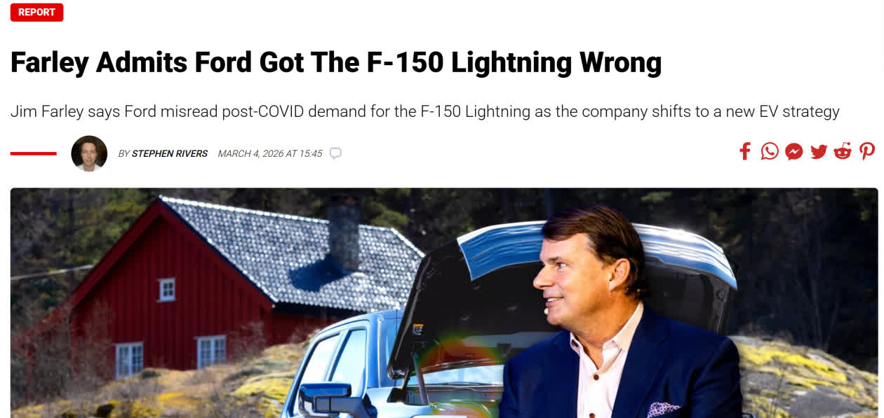 3月6日消息,據(jù)Carscoops報(bào)道,福特公司首席執(zhí)行官吉姆·法利近日就旗下純電皮卡F-150 Lightning項(xiàng)目的失利作出反思,明確表示福特在該項(xiàng)目上對(duì)市場(chǎng)需求和行業(yè)發(fā)展趨勢(shì)存在明顯誤判,同時(shí)坦言燃油車時(shí)代的思維慣性成為企業(yè)發(fā)展純電車型的重要掣肘。