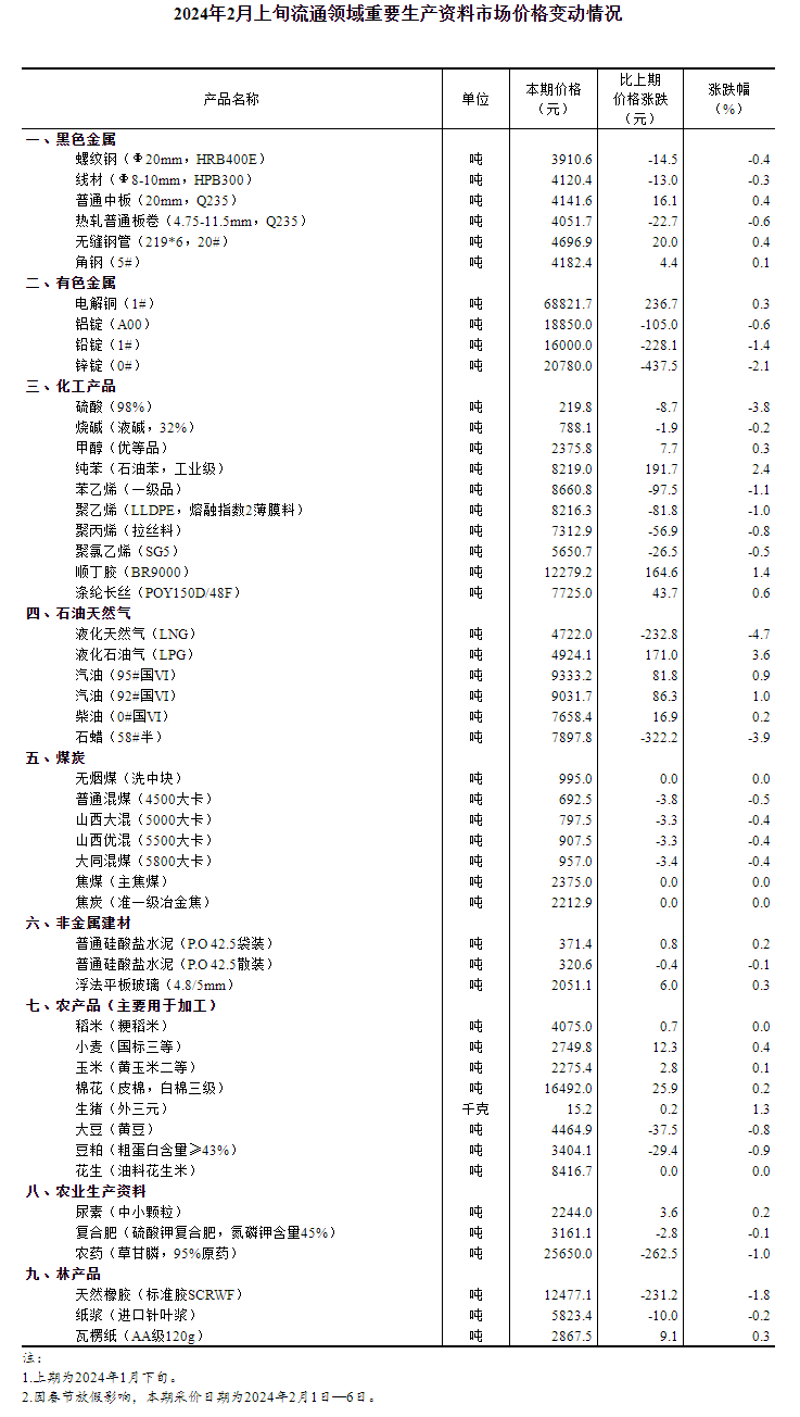 國家統(tǒng)計局發(fā)布消息,據(jù)對全國流通領(lǐng)域9大類50種重要生產(chǎn)資料市場價格的監(jiān)測顯示,2024年2月上旬與1月下旬相比,20種產(chǎn)品價格上漲,25種下降,5種持平。