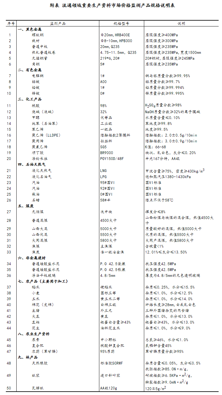流通領(lǐng)域重要生產(chǎn)資料市場價格監(jiān)測內(nèi)容包括9大類50種產(chǎn)品的價格。類別與產(chǎn)品規(guī)格說明詳見附表。