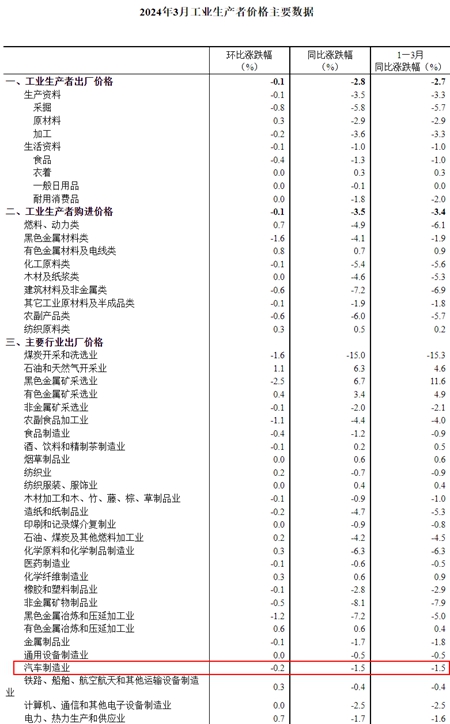 此外,國家統(tǒng)計(jì)局還發(fā)布了全國工業(yè)生產(chǎn)者出廠價(jià)格,其3月份同比下降2.8%,環(huán)比下降0.1%;一季度,工業(yè)生產(chǎn)者出廠價(jià)格比上年同期下降2.7%。其中,汽車制造業(yè)出廠價(jià)格環(huán)比微降0.2%,同比下降1.5%;綜合1-3月,累計(jì)下降1.5%。