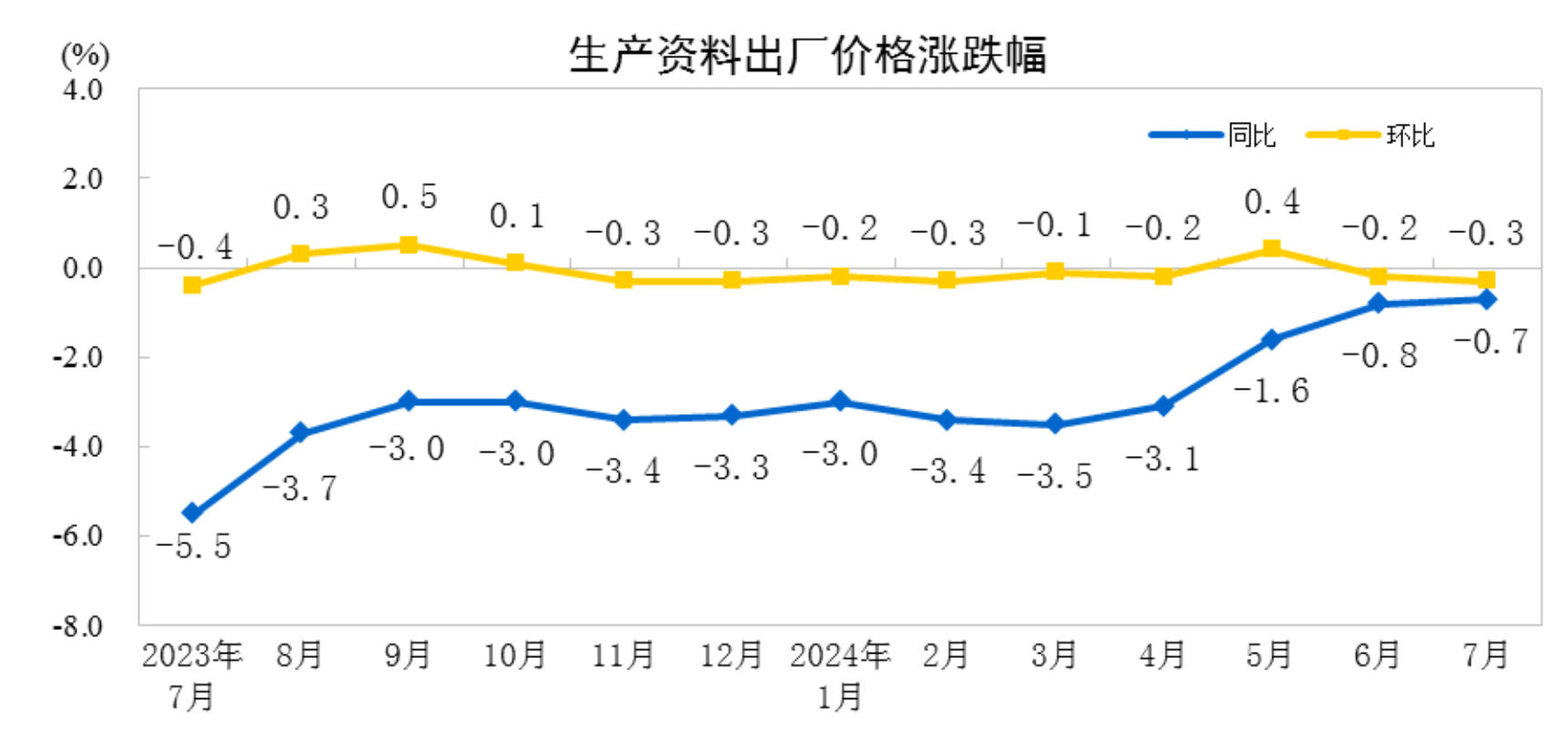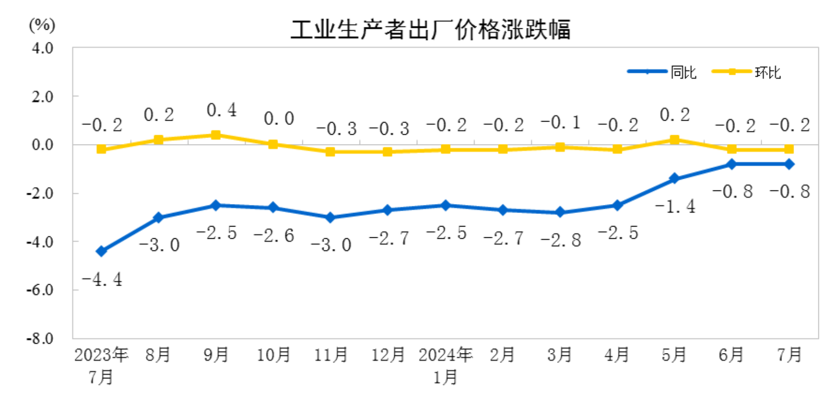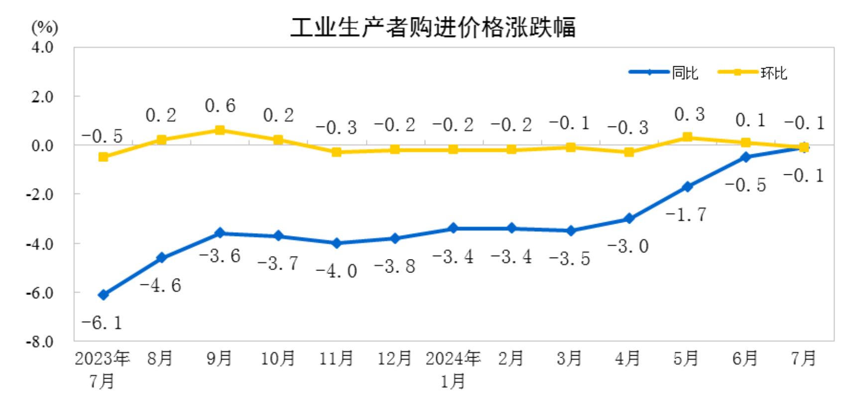 2024年7月份,全國工業(yè)生產(chǎn)者出廠價(jià)格同比下降0.8%,環(huán)比下降0.2%,降幅均與上月相同;工業(yè)生產(chǎn)者購進(jìn)價(jià)格同比、環(huán)比均下降0.1%。1—7月平均,工業(yè)生產(chǎn)者出廠價(jià)格比上年同期下降2.0%,工業(yè)生產(chǎn)者購進(jìn)價(jià)格下降2.2%。
