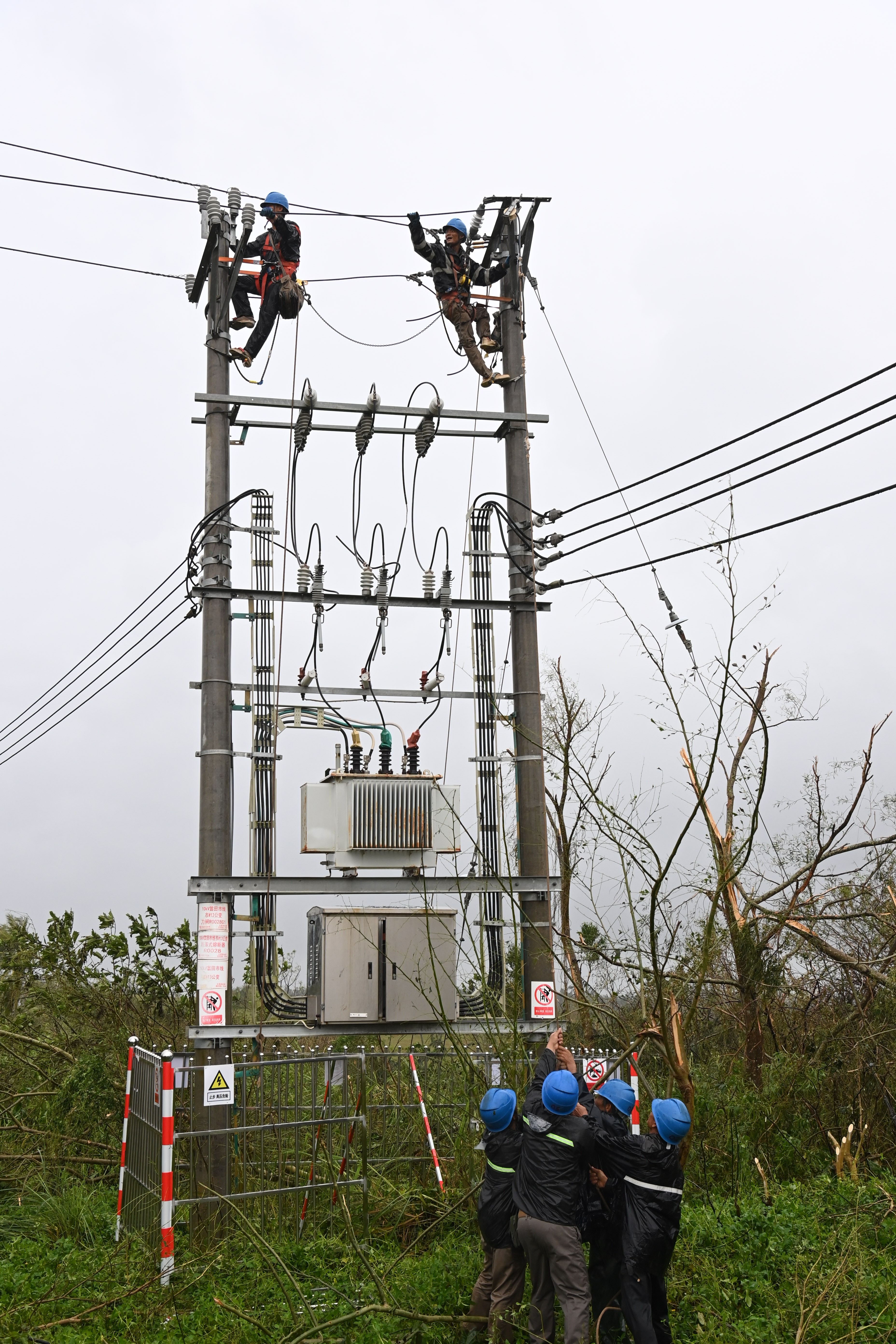 9月7日,臺(tái)風(fēng)登陸中心海南文昌市翁田鎮(zhèn),南方電網(wǎng)公司工作人員在搶修復(fù)電。周志旺 攝