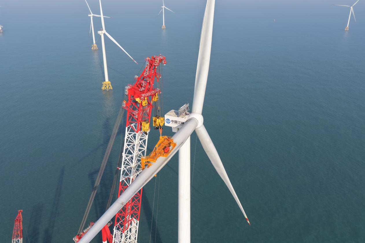 在大型起重裝備的操控下,風(fēng)機(jī)第三支葉片與機(jī)艙輪轂精準(zhǔn)對(duì)接并完成螺栓緊固,標(biāo)志著全球首臺(tái)20兆瓦海上風(fēng)電機(jī)組吊裝作業(yè)順利完成。(三峽集團(tuán)福建分公司供圖)