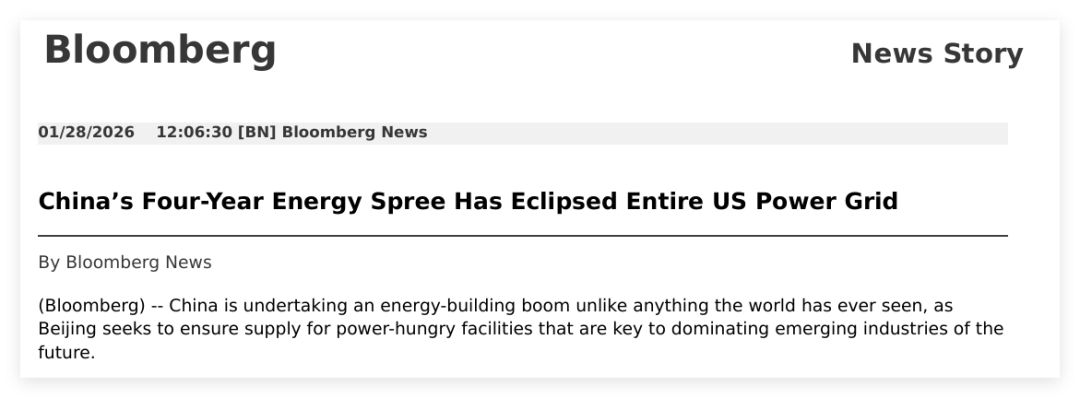 長(zhǎng)期密切關(guān)注中國(guó)能源市場(chǎng)的彭博社,在28日的最新報(bào)道中,用一張直觀的圖片清晰呈現(xiàn)了兩組數(shù)據(jù)的全球分量:中國(guó)截至2025年底達(dá)到38.9億千瓦的全國(guó)累計(jì)發(fā)電裝機(jī)容量,以及2025年一年新增的5.43億千瓦發(fā)電裝機(jī)容量。