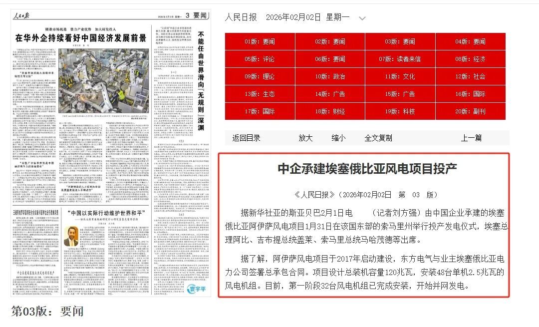 1月31日,由東方電氣集團(tuán)所屬東方國際承建的埃塞俄比亞最大風(fēng)電項(xiàng)目阿伊薩風(fēng)電項(xiàng)目舉行首期工程發(fā)電投產(chǎn)儀式。埃塞俄比亞總理阿比、吉布提總統(tǒng)蓋萊、索馬里總統(tǒng)馬哈茂德等出席。中國駐埃塞俄比亞大使館大使陳海、公使銜參贊劉曉光出席儀式。