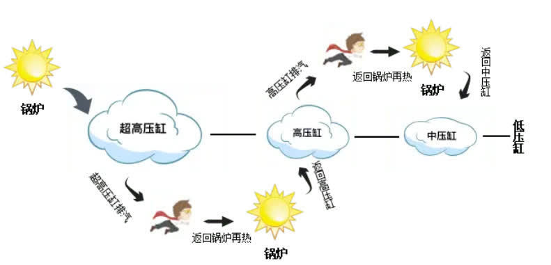 一次再熱技術(shù),是在過熱器后設(shè)置再熱器,將汽輪機(jī)高壓缸做功后的過熱蒸汽返回再熱器進(jìn)行再次加熱,進(jìn)入汽輪機(jī)中壓缸繼續(xù)做功發(fā)電。通過一個(gè)小改進(jìn),對功率進(jìn)行了大提升。