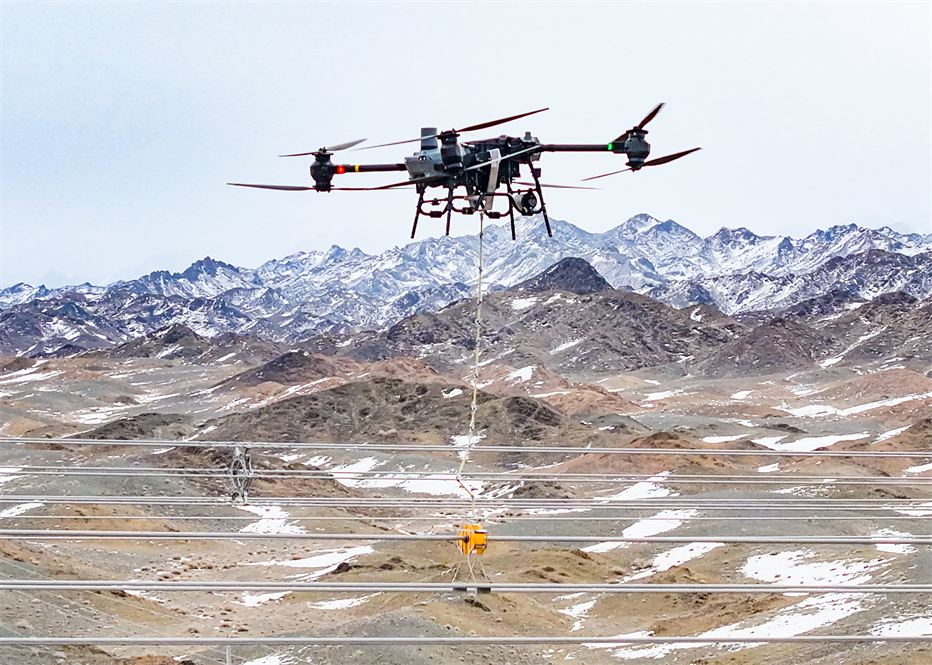 新疆送變電公司員工利用大載重?zé)o人機(jī)吊裝“觀冰精靈”設(shè)備。張靈軍攝