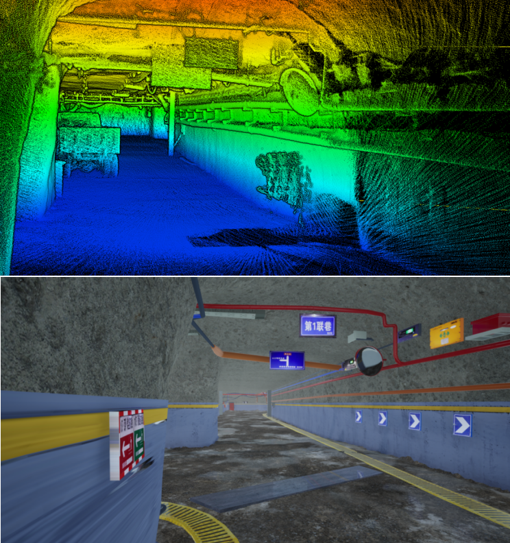 巷道,是煤礦進(jìn)行生產(chǎn)活動(dòng)的主要場(chǎng)所,是構(gòu)建智慧礦山和透明地質(zhì)的重要節(jié)點(diǎn),因其內(nèi)部環(huán)境復(fù)雜多變,一直是測(cè)量成像的難點(diǎn)。西安研究院透明地質(zhì)公司積極探索新技術(shù),采用先進(jìn)的便攜式激光掃描設(shè)備,對(duì)煤礦全巷道進(jìn)行全面細(xì)致的掃描,結(jié)合全局標(biāo)定與配準(zhǔn)技術(shù),成功構(gòu)建高精度點(diǎn)云模型。通過(guò)該模型不僅可以全面呈現(xiàn)巷道的實(shí)際尺寸和結(jié)構(gòu),為煤礦井下設(shè)備精準(zhǔn)定位提供數(shù)據(jù)支持,還能通過(guò)接入礦方實(shí)時(shí)動(dòng)態(tài)數(shù)據(jù)庫(kù),實(shí)現(xiàn)模型數(shù)據(jù)的實(shí)時(shí)動(dòng)態(tài)更新及可視化展示,為礦方的智能定位、智能巡檢和安全監(jiān)測(cè)工作提供了模型級(jí)支撐,提升了煤礦安全生產(chǎn)水平。