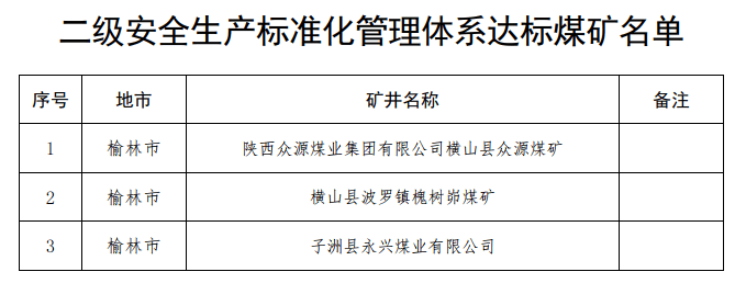 按照《煤礦安全生產(chǎn)標(biāo)準(zhǔn)化管理體系考核定級(jí)辦法》及《陜西省煤礦安全生產(chǎn)標(biāo)準(zhǔn)化管理體系考核定級(jí)實(shí)施細(xì)則(試行)》(陜應(yīng)急〔2020〕140號(hào))規(guī)定,經(jīng)資料審查、現(xiàn)場(chǎng)檢查、網(wǎng)上公示,現(xiàn)對(duì)達(dá)到二級(jí)安全生產(chǎn)標(biāo)準(zhǔn)化管理體系的3處煤礦(名單見附件)予以公告,自公告之日起有效期3年,在有效期內(nèi)享受《關(guān)于大力推進(jìn)煤礦安全生產(chǎn)標(biāo)準(zhǔn)化建設(shè)工作的通知》(安監(jiān)總煤行〔2017〕59號(hào))有關(guān)激勵(lì)政策。