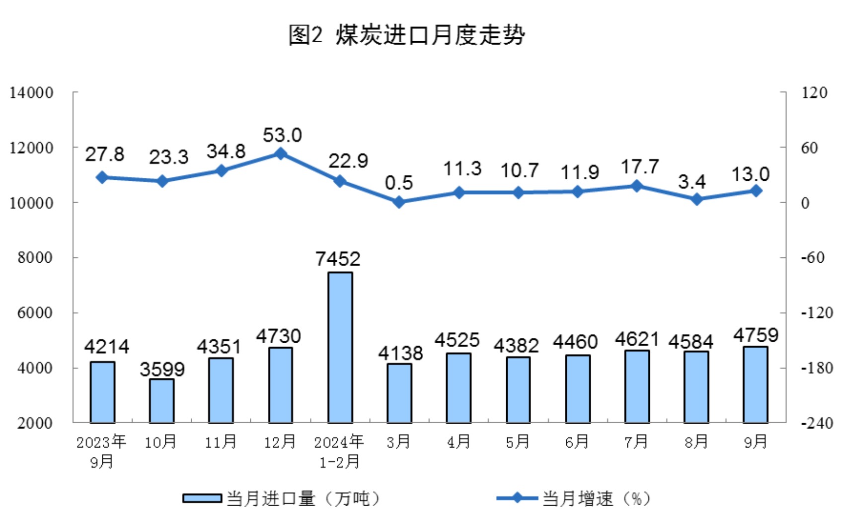 原煤生產(chǎn)增速加快。9月份,規(guī)上工業(yè)原煤產(chǎn)量4.1億噸,同比增長4.4%,增速比8月份加快1.6個百分點;日均產(chǎn)量1381.5萬噸。進口煤炭4759萬噸,同比增長13.0%。