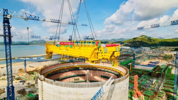 中國電力新聞網(wǎng)訊 8月24日,華龍一號批量化工程——福建漳州核電1號機組環(huán)吊橋架整體吊裝就位,這是華龍一號核電機組首次實現(xiàn)環(huán)吊整體吊裝“零的突破”,為該機組主設(shè)備施工提前釋放了工作面,為后續(xù)主設(shè)備引入及內(nèi)穹頂?shù)跹b打下堅實基礎(chǔ)。