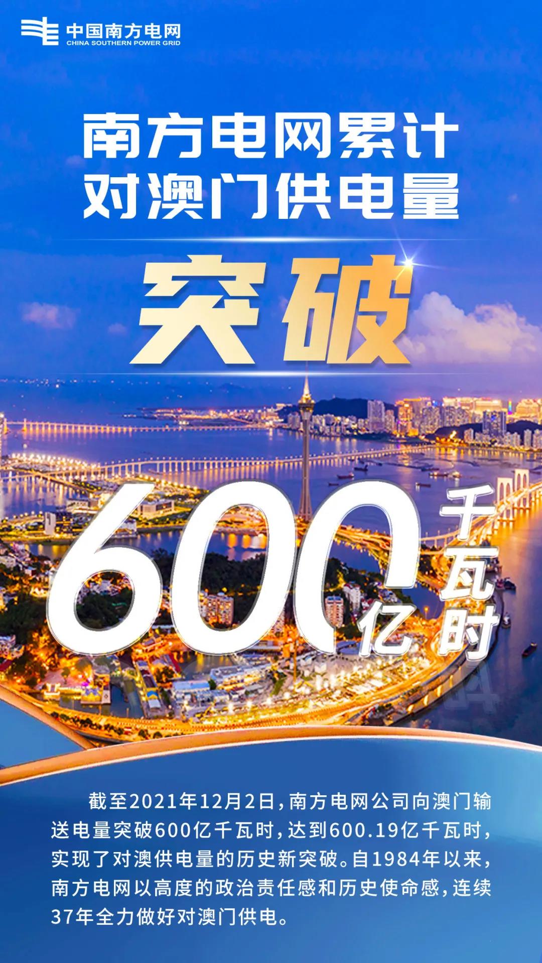 中國電力新聞網(wǎng)訊 截至2021年12月,南方電網(wǎng)公司向澳門輸送電量突破600億千瓦時,實現(xiàn)了對澳供電量的歷史新突破。