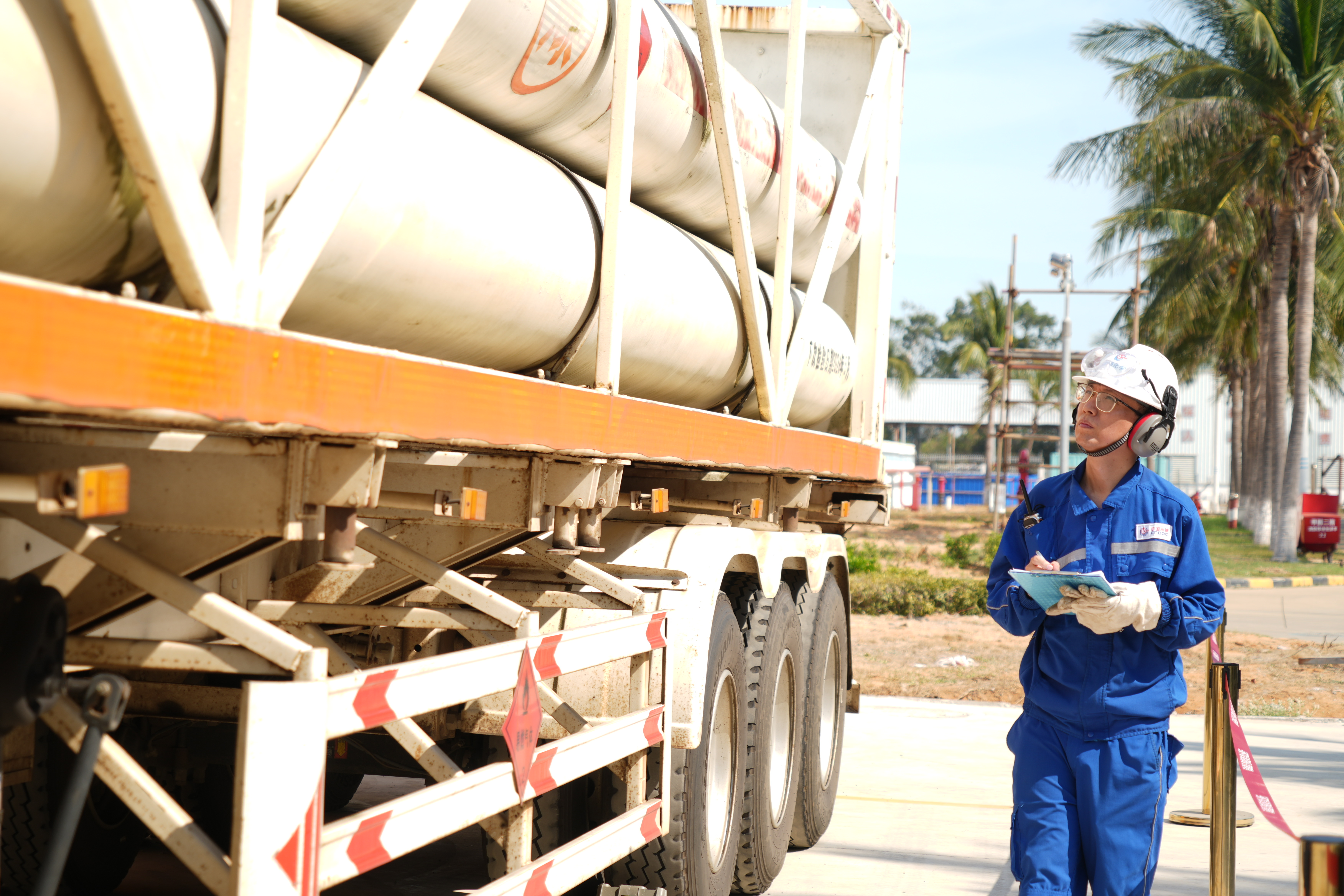 圖為中國海油化學(xué)富島公司工作人員正在檢查生物質(zhì)原料運(yùn)輸車。任志達(dá)攝